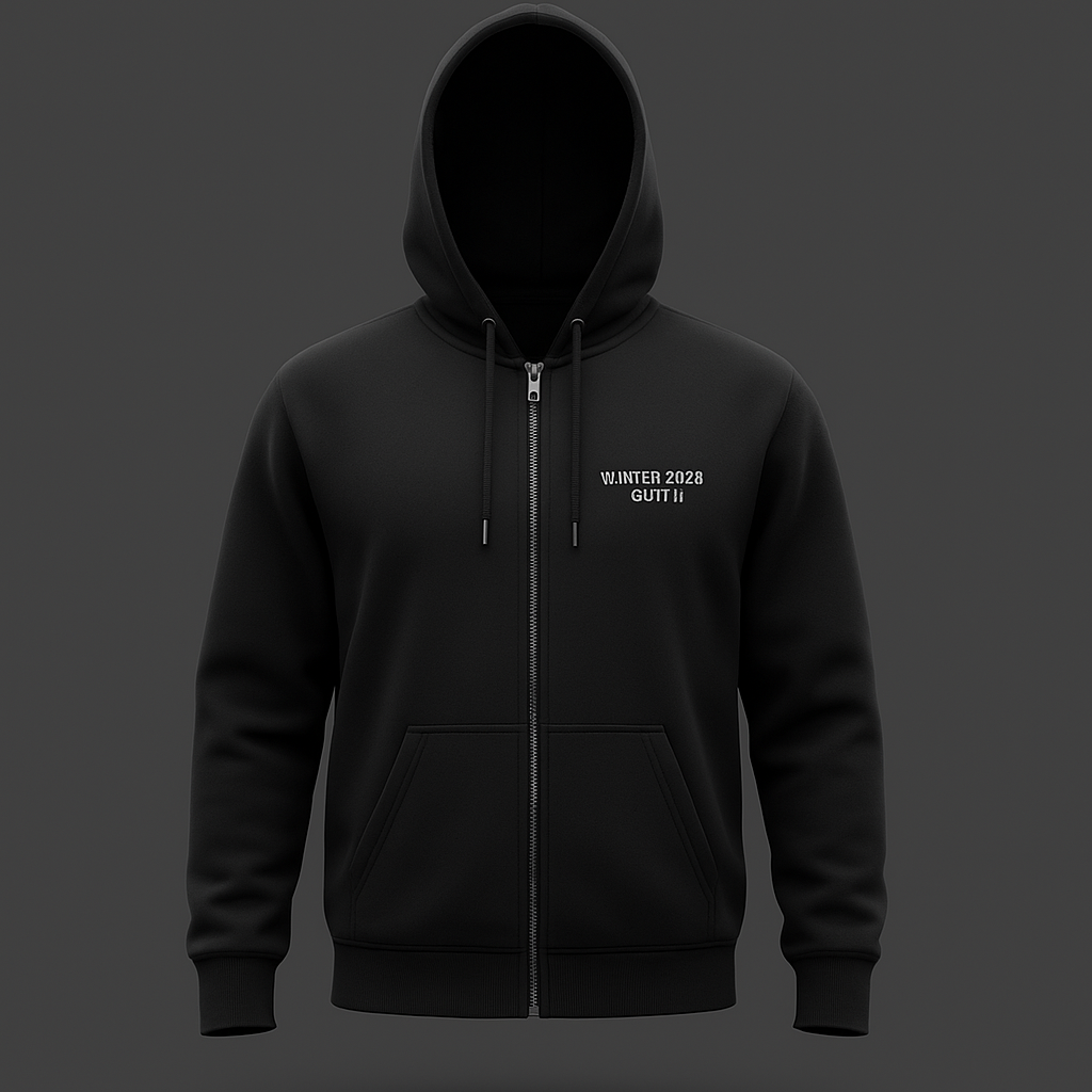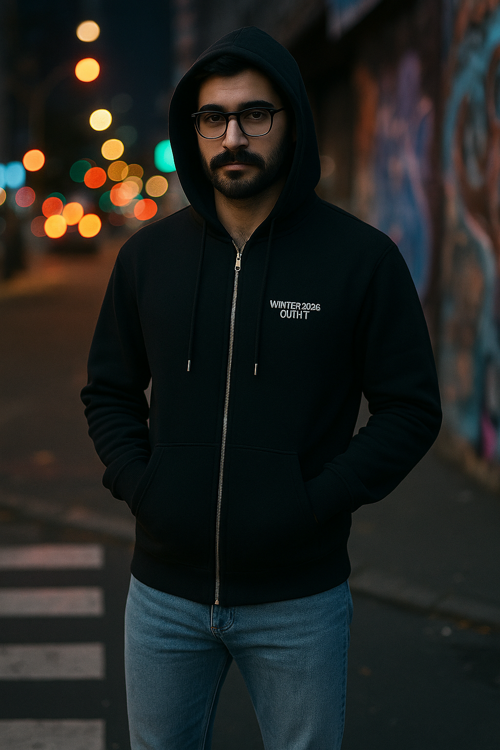 هودی مشکی زیپدار WINTER 2026 OUTFIT؛ کلاهدار، فیت استاندارد، پارچهی دورس نرم با آستر لطیف. زیپ روان، جیب کانگورویی دولپه و چاپ مینیمال سینه (یکخطی و کوچک). مناسب استریتاستایل، دانشگاه و استفادهی روزمره در پاییز و زمستان.